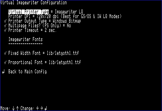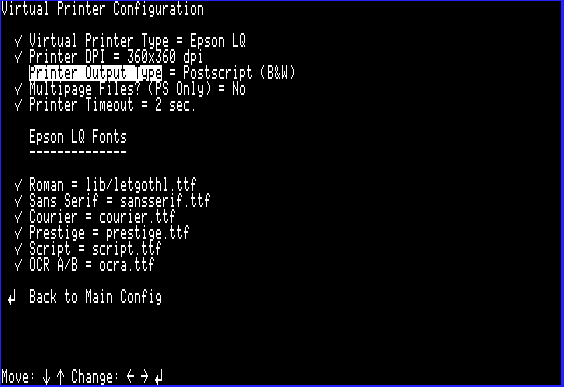 Next, navigate back to the main menu and select the "Virtual Printer Configuration" option and set "Printer Output Type" to either "Windows Bitmap" or "Postscript (B&W)" based on your preference: