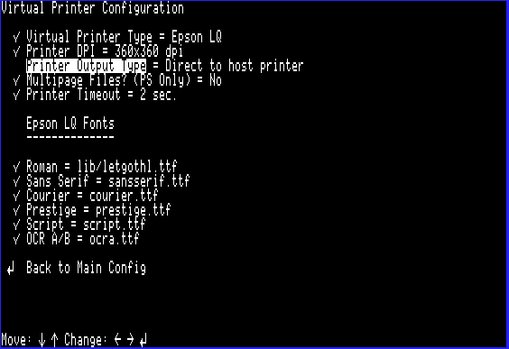 Next, navigate back to the main menu and select the "Virtual Printer Configuration" option and set "Printer Output Type" to "Direct to host printer:"